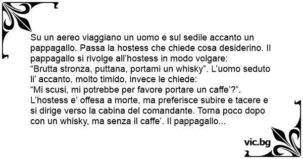 “Mi scusi, mi potrebbe per favore portare un caffe’?”. L’hostess e’ offesa a morte, ma preferisce subire e tacere e si dirige verso la cabina del comandante. Torna poco dopo соn un whisky, ma senza il caffe’. Il pappagallo beve, ma subito dopo ricomincia a sbraitare: