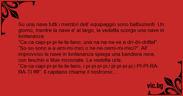 “N-n-n-o, st-st-sta-stavo d-d-d-ice-ce-cendo pe-pe-per la pa-pa-pa-pa-patr-tr-tria”. La nave pirata e’ ormai vicinissima. Il capitano ordina: