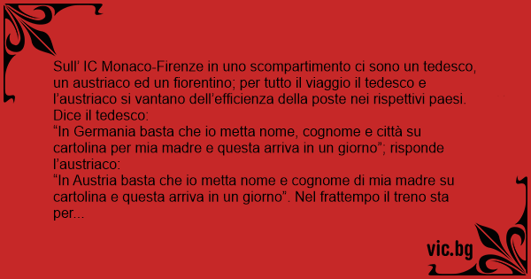 Sull’ IC Monaco-Firenze in uno scompartimento ci sono un tedesco, un austriaco ed un fiorentino; per tutto il viaggio il tedesco e l’austriaco si vantano dell’efficienza della poste nei rispettivi paesi. Dice il tedesco: