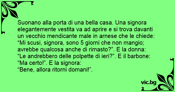 Suonano alla porta di una bella casa. Una signora elegantemente vestita va ad aprire e si trova davanti un vecchio mendicante male in arnese che le chiede: