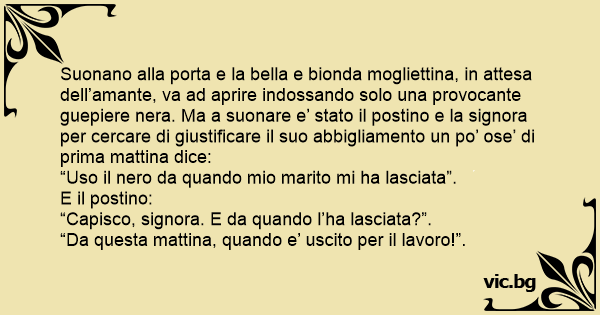 Suonano alla porta e la bella e bionda mogliettina, in attesa dell’amante, va ad aprire indossando solo una provocante guepiere nera. Ma a suonare e’ stato il postino e la signora per cercare di giustificare il suo abbigliamento un po’ ose’ di prima mattina dice: