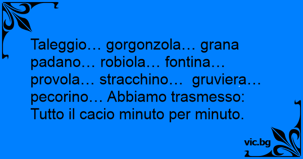 Taleggio… gorgonzola… grana padano… robiola… fontina… provola… stracchino… gruviera… pecorino… Abbiamo trasmesso: Tutto il cacio minuto per minuto.