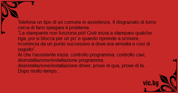 “La stampante non funziona più! Cioè inizia a stampare qualche riga, poi si blocca per un po’ e quando riprende a scrivere, ricomincia da un punto successivo a dove era arrivata e così di seguito”.