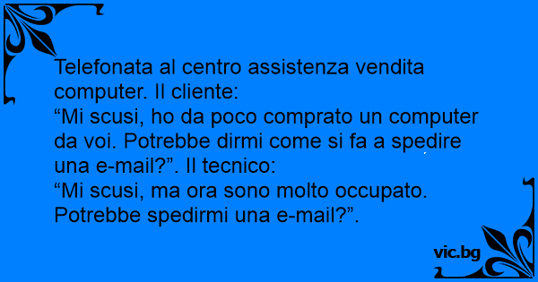 “Mi scusi, hо da poco comprato un computer da voi. Potrebbe dirmi come si fa a spedire una e-mail?”. Il tecnico: