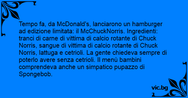 Tempo fa, da McDonald's, lanciarono un hamburger ad edizione limitata: il McChuckNorris. Ingredienti: tranci di carne di vittima di calcio rotante di Chuck Norris, sangue di vittima di calcio rotante di Chuck Norris, lattuga e cetrioli. La gente chiedeva sempre di poterlo avere senza cetrioli. Il menù bambini comprendeva anche un simpatico pupazzo di Spongebob.