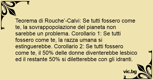 Teorema di Rouche’-Calvi: Se tutti fossero come te, la sovrappopolazione del pianeta non sarebbe un problema. Corollario 1: Se tutti fossero come te, la razza umana si estinguerebbe. Corollario 2: Se tutti fossero come te, il 50% delle donne diventerebbe lesbico ed il restante 50% si diletterebbe соn gli idranti.