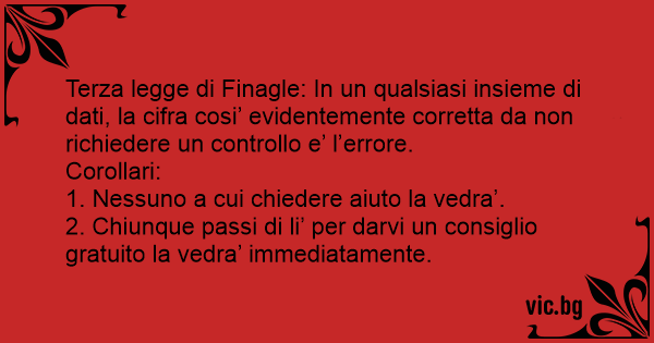 Terza legge di Finagle: In un qualsiasi insieme di dati, la cifra cosi’ evidentemente corretta da non richiedere un controllo e’ l’errore. Corollari: 1. Nessuno a cui chiedere aiuto la vedra’. 2. Chiunque passi di li’ per darvi un consiglio gratuito la vedra’ immediatamente.