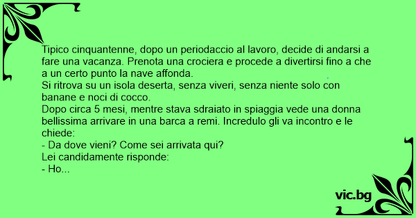 Dopo circa 5 mesi, mentre stava sdraiato in spiaggia vede una donna bellissima arrivare in una barca a remi. Incredulo gli va incontro e le chiede: