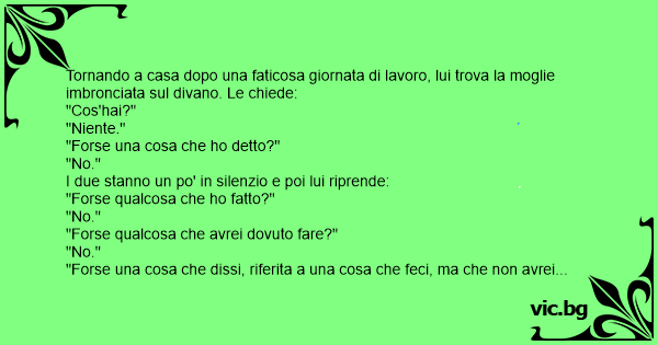 Tornando a casa dopo una faticosa giornata di lavoro, lui trova la moglie imbronciata sul divano. Le chiede: