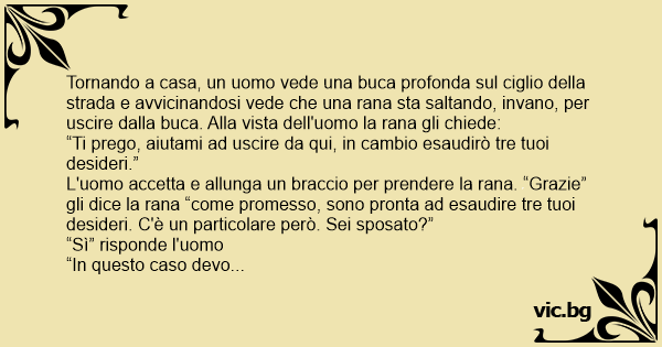 L'uomo accetta e allunga un braccio per prendere la rana. “Grazie” gli dice la rana “come promesso, sono pronta ad esaudire tre tuoi desideri. C'è un particolare però. Sei sposato?”