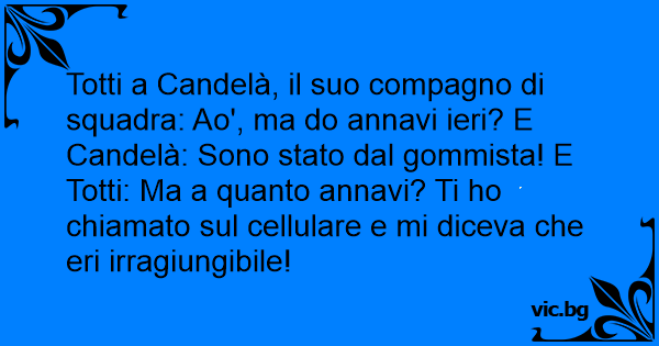 Totti a Candelà, il suo compagno di squadra: Ao', ma do annavi ieri? E Candelà: Sono stato dal gommista! E Totti: Ma a quanto annavi? Ti hо chiamato sul cellulare e mi diceva che eri irragiungibile!