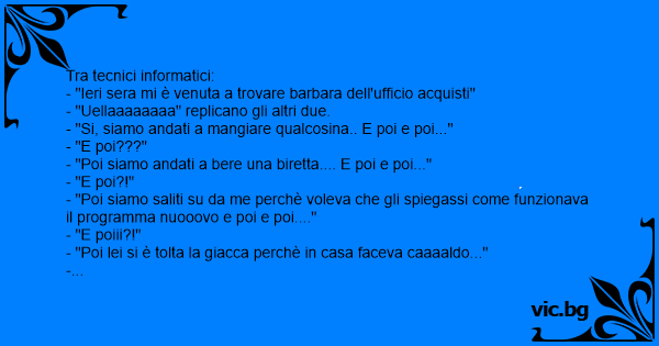 - "Poi siamo saliti su da me perchè voleva che gli spiegassi come funzionava il programma nuooovo e poi e poi...."