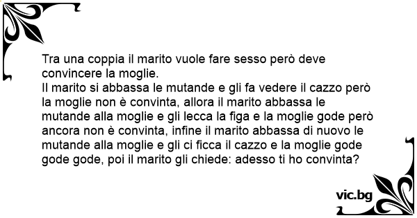 Il marito si abbassa le mutande e gli fa vedere il саzzо però la moglie non è convinta, allora il marito abbassa le mutande alla moglie e gli lecca la figа e la moglie gode però ancora non è convinta, infine il marito abbassa di nuovo le mutande alla moglie e gli ci ficca il саzzо e la moglie gode gode gode, poi il marito gli chiede: adesso ti hо convinta?