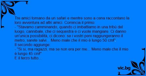 - "Stavamo camminando, quando ci imbattiamo in una tribù del luogo, cannibale, che ci sequestra e ci vuole mangiare. Ci danno un'unica possibilità, ci dicono: se i vostri peni raggiungeranno il metro, sarete salvi... Meno male che il mio è lungo 50 cm!"