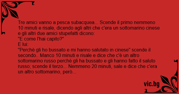 Tre amici vanno a pesca subacquea... Scende il primo nemmeno 10 minuti e risale, dicendo agli altri che c'era un sottomarino cinese e gli altri due amici stupefatti dicono: