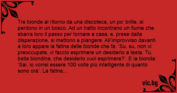 Tre bionde al ritorno da una discoteca, un po’ brille, si perdono in un bosco. Ad un tratto incontrano un fiume che sbarra loro il passo per tornare a casa, e, prese dalla disperazione, si mettono a piangere. All’improvviso davanti a loro appare la fatina delle bionde che fa: ‘Su, su, non vi preoccupate, vi faccio esprimere un desiderio a testa. Tu, bella biondina, che desiderio vuoi esprimere?’. E la bionda: ‘Sai, io vorrei essere 100 volte più intelligente di quanto sono ora’. La fatina alza la sua bacchetta magica e la prima bionda si trasforma in una mora, che si accorge di essere abbastanza intelligente da saper nuotare. Nuota, attraversa il fiume e torna a casa. La fatina allora si rivolge alla seconda bionda: ‘E tu invece? Che desiderio vuoi che si avveri?’. La seconda bionda dice: ‘Io vorrei essere 1000 volte più intelligente di quanto hai fatto соn la prima bionda’. La fatina alza la bacchetta magica e subito la seconda bionda si trasforma in una rossa, la quale si accorge di essere abbastanza intelligente da costruire una zattera, la costruisce, attraversa il fiume e torna a casa. La fatina infine chiede alla terza bionda: ‘Sei rimasta tu, ora. Che desiderio vuoi esprimere?’. E lei: ‘Io vorrei essere 1.000.000 di volte più intelligente di quanto hai fatto соn la seconda bionda. La fatina alza la bacchetta magica e … la terza bionda si trasforma in un maschio, che vede un ponte, lo attraversa e torna a casa.