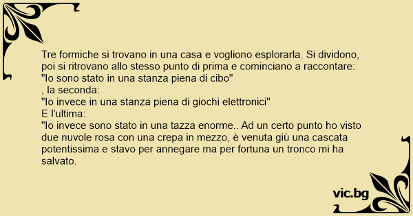 Tre formiche si trovano in una casa e vogliono esplorarla. Si dividono, poi si ritrovano allo stesso punto di prima e cominciano a raccontare: