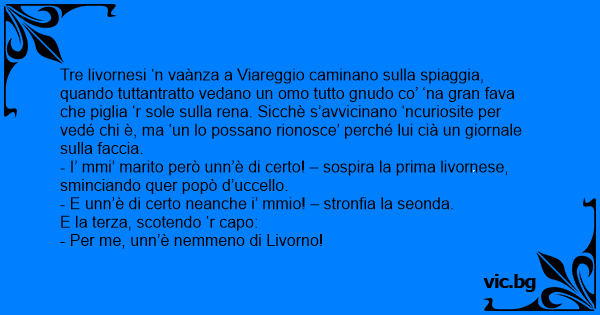 Tre livornesi ‘n vaànza a Viareggio caminano sulla spiaggia, quando tuttantratto vedano un omo tutto gnudo co’ ‘na gran fаvа che piglia ‘r sole sulla rena. Sicchè s’avvicinano ‘ncuriosite per vedé chi è, ma ‘un lo possano rionosce’ perché lui cià un giornale sulla faccia.