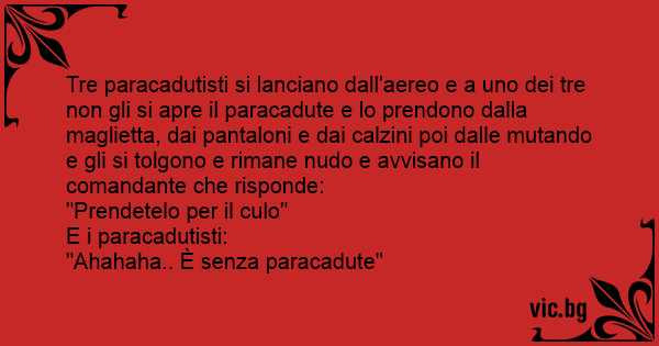 Tre paracadutisti si lanciano dall'aereo e a uno dei tre non gli si apre il paracadute e lo prendono dalla maglietta, dai pantaloni e dai calzini poi dalle mutando e gli si tolgono e rimane nudо e avvisano il comandante che risponde: