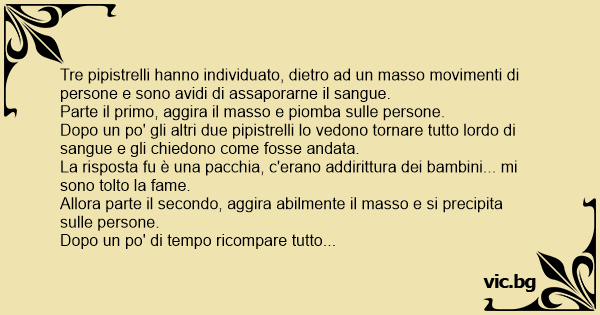 Tre pipistrelli hanno individuato, dietro ad un masso movimenti di persone e sono avidi di assaporarne il sangue. Parte il primo, aggira il masso e piomba sulle persone. Dopo un po' gli altri due pipistrelli lo vedono tornare tutto lordo di sangue e gli chiedono come fosse andata. La risposta fu è una pacchia, c'erano addirittura dei bambini... mi sono tolto la fame. Allora parte il secondo, aggira abilmente il masso e si precipita sulle persone. Dopo un po' di tempo ricompare tutto sporco di sangue e dice che addirittura aveva bevuto il sangue dal collo di fanciulle vergini. Parte anche il terzo che non vedeva l'ora di farsi anche lui una scorpacciata di sangue... ma era ormai trascorsa un'ora ed ancora non si vedeva. I suoi due amici cominciavano a preoccuparsi quando all'improvviso lo vedono arrivare. Era tutto sporco di sangue anche lui e quando gli chiesero com'era andata rispose che per la voglia di fare in fretta a bere il sangue NON ERA RIUSCITO A SCHIVARE IL MASSO.