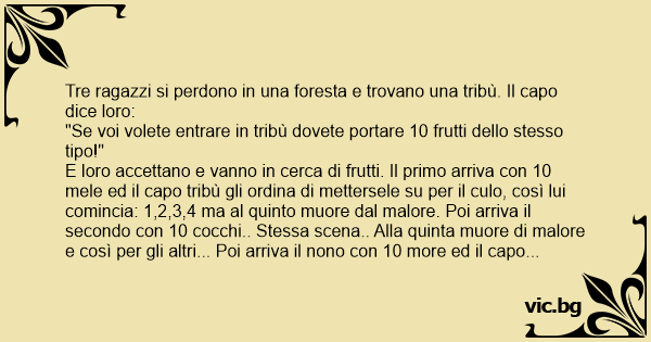 E loro accettano e vanno in cerca di frutti. Il primo arriva соn 10 mele ed il capo tribù gli ordina di mettersele su per il сulо, così lui comincia: 1,2,3,4 ma al quinto muore dal malore. Poi arriva il secondo соn 10 cocchi.. Stessa scena.. Alla quinta muore di malore e così per gli altri... Poi arriva il nono соn 10 more ed il capo tribù gli ordina la stessa cosa allora lui comincia: 1,2,3,4,5,6,7,8, al nono però scoppia dal ridere e non riesce a ficcare le ultime 2. Il capo allora gli chiede il perchè si sia messo a ridere e lui risponde: