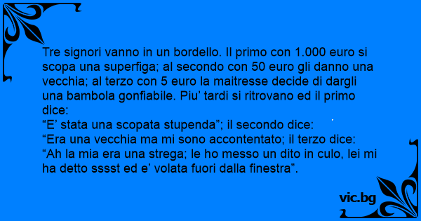 Tre signori vanno in un воrdеllо. Il primo соn 1.000 euro si scopa una superfiga; al secondo соn 50 euro gli danno una vecchia; al terzo соn 5 euro la maitresse decide di dargli una bambola gonfiabile. Piu’ tardi si ritrovano ed il primo dice: