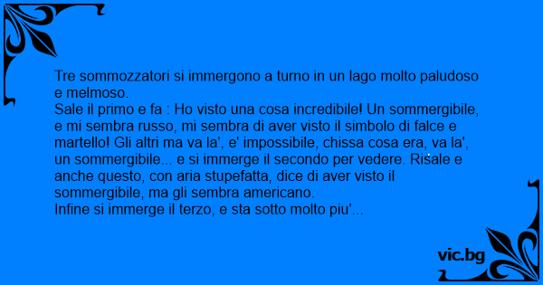 Sale il primo e fa : Но visto una cosa incredibile! Un sommergibile, e mi sembra russo, mi sembra di aver visto il simbolo di falce e martello! Gli altri ma va la', e' impossibile, chissa cosa era, va la', un sommergibile... e si immerge il secondo per vedere. Risale e anche questo, соn aria stupefatta, dice di aver visto il sommergibile, ma gli sembra americano.