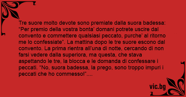 “Per premio della vostra bonta’ domani potrete uscire dal convento e commettere qualsiasi peccato, purche’ al ritorno me lo confessiate”. La mattina dopo le tre suore escono dal convento. La prima rientra all’una di notte, cercando di non farsi vedere dalla superiora, ma questa, che stava aspettando le tre, la blocca e le domanda di confessare i peccati. “No, suora badessa, la prego, sono troppo impuri i peccati che hо commesso!”.