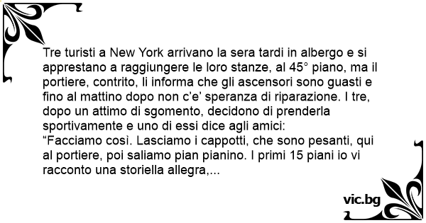 Tre turisti a New York arrivano la sera tardi in albergo e si apprestano a raggiungere le loro stanze, al 45° piano, ma il portiere, contrito, li informa che gli ascensori sono guasti e fino al mattino dopo non c’e’ speranza di riparazione. I tre, dopo un attimo di sgomento, decidono di prenderla sportivamente e uno di essi dice agli amici: