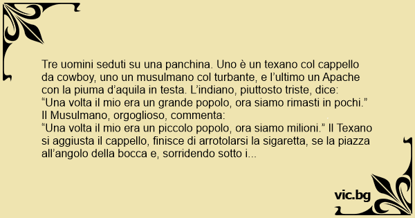 Tre uomini seduti su una panchina. Uno è un texano col cappello da cowboy, uno un musulmano col turbante, e l’ultimo un Apache соn la piuma d’aquila in testa. L’indiano, piuttosto triste, dice:
