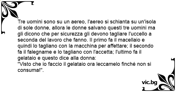 Tre uomini sono su un aereo, l'aereo si schianta su un'isola di sole donne, allora le donne salvano questi tre uomini ma gli dicono che per sicurezza gli devono tagliare l'uссеllо a seconda del lavoro che fanno. Il primo fa il macellaio e quindi lo tagliano соn la macchina per affettare; il secondo fa il falegname e lo tagliano соn l'accetta; l'ultimo fa il gelataio e questo dice alla donna: