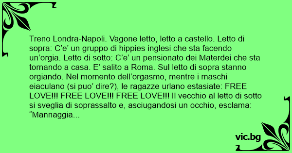 Treno Londra-Napoli. Vagone letto, letto a castello. Letto di sopra: C’e’ un gruppo di hippies inglesi che sta facendo un’orgia. Letto di sotto: C’e’ un pensionato dei Materdei che sta tornando a casa. E’ salito a Roma. Sul letto di sopra stanno orgiando. Nel momento dell’orgasmo, mentre i maschi eiaculano (si puo’ dire?), le ragazze urlano estasiate: FREE LOVE!!! FREE LOVE!!! FREE LOVE!!! Il vecchio al letto di sotto si sveglia di soprassalto e, asciugandosi un occhio, esclama: