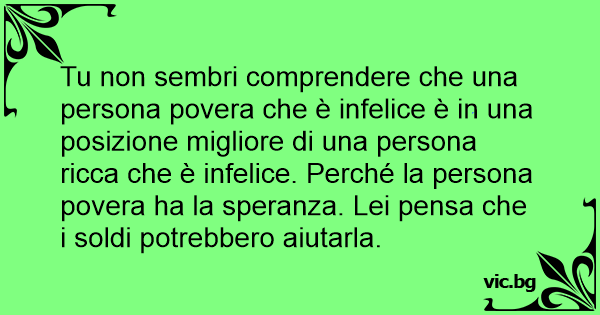Tu non sembri comprendere che una persona povera che è infelice è in una posizione migliore di una persona ricca che è infelice. Perché la persona povera ha la speranza. Lei pensa che i soldi potrebbero aiutarla.