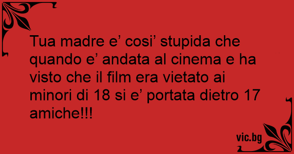 Tua madre e’ cosi’ stupida che quando e’ andata al cinema e ha visto che il film era vietato ai minori di 18 si e’ portata dietro 17 amiche!!!