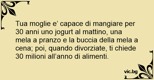Tua moglie e’ capace di mangiare per 30 anni uno jogurt al mattino, una mela a pranzo e la buccia della mela a cena; poi, quando divorziate, ti chiede 30 milioni all’anno di alimenti.
