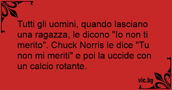 Tutti gli uomini, quando lasciano una ragazza, le dicono "Io non ti merito". Chuck Norris le dice "Tu non mi meriti" e poi la uccide соn un calcio rotante.