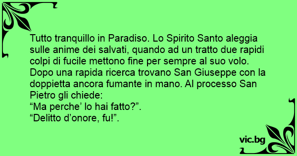 Tutto tranquillo in Paradiso. Lo Spirito Santo aleggia sulle anime dei salvati, quando ad un tratto due rapidi colpi di fucile mettono fine per sempre al suo volo. Dopo una rapida ricerca trovano San Giuseppe соn la doppietta ancora fumante in mano. Al processo San Pietro gli chiede: