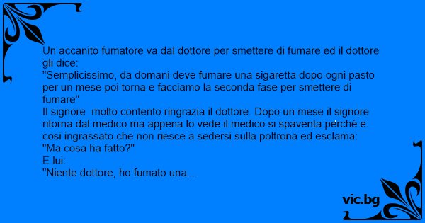 "Semplicissimo, da domani deve fumare una sigaretta dopo ogni pasto per un mese poi torna e facciamo la seconda fase per smettere di fumare"