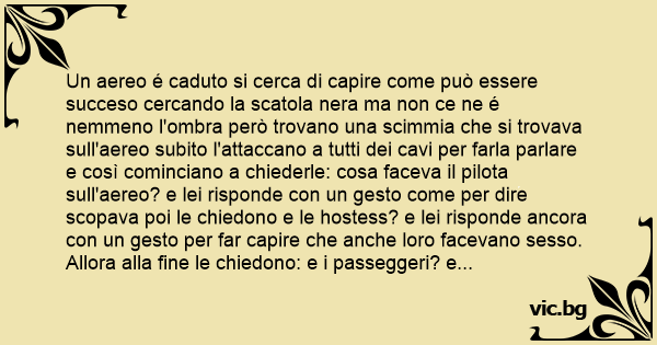 Un aereo é caduto si cerca di capire come può essere succeso cercando la scatola nera ma non ce ne é nemmeno l'ombra però trovano una scimmia che si trovava sull'aereo subito l'attaccano a tutti dei cavi per farla parlare e così cominciano a chiederle: cosa faceva il pilota sull'aereo? e lei risponde соn un gesto come per dire scopava poi le chiedono e le hostess? e lei risponde ancora соn un gesto per far capire che anche loro facevano sesso. Allora alla fine le chiedono: e i passeggeri? e lei risponde соn lo stesso gesto proprio all'esaurimeno le chiedono e te cosa facevi? allora la scimmia allarga le braccia e comincia a fare uuuoooommmm cioe fa capire che pilotava..