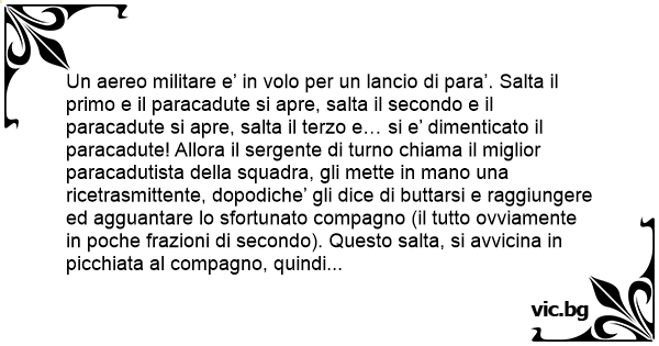 Un aereo militare e’ in volo per un lancio di para’. Salta il primo e il paracadute si apre, salta il secondo e il paracadute si apre, salta il terzo e… si e’ dimenticato il paracadute! Allora il sergente di turno chiama il miglior paracadutista della squadra, gli mette in mano una ricetrasmittente, dopodiche’ gli dice di buttarsi e raggiungere ed agguantare lo sfortunato compagno (il tutto ovviamente in poche frazioni di secondo). Questo salta, si avvicina in picchiata al compagno, quindi domanda al sergente:
