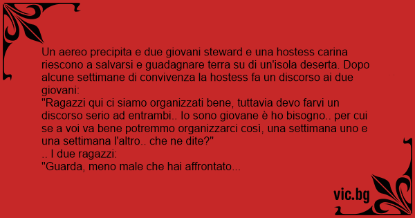 Un aereo precipita e due giovani steward e una hostess carina riescono a salvarsi e guadagnare terra su di un'isola deserta. Dopo alcune settimane di convivenza la hostess fa un discorso ai due giovani: