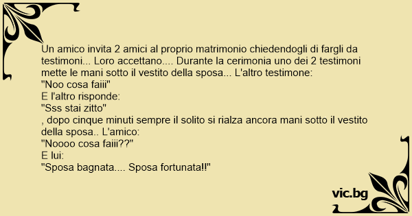 Un amico invita 2 amici al proprio matrimonio chiedendogli di fargli da testimoni... Loro accettano.... Durante la cerimonia uno dei 2 testimoni mette le mani sotto il vestito della sposa... L'altro testimone: