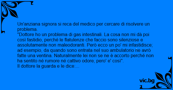 "Dottore hо un problema di gas intestinali. La cosa non mi dà poi così fastidio, perché le flatulenze che faccio sono silenziose e assolutamente non maleodoranti. Però ecco un po' mi infastidisce; ad esempio, da quando sono entrata nel suo ambulatorio ne avrò fatte una ventina. Naturalmente lei non se ne è accorto perché non ha sentito né rumore né cattivo odore, pero' e' così".