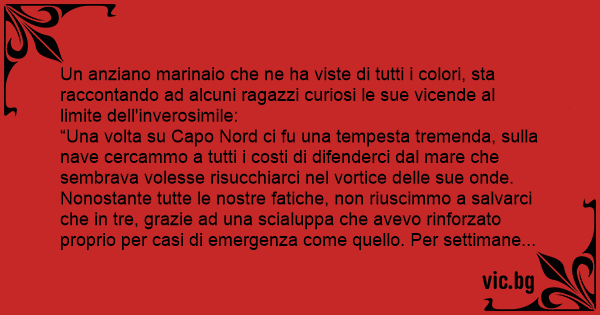 Un anziano marinaio che ne ha viste di tutti i colori, sta raccontando ad alcuni ragazzi curiosi le sue vicende al limite dell'inverosimile: “Una volta su Capo Nord ci fu una tempesta tremenda, sulla nave cercammo a tutti i costi di difenderci dal mare che sembrava volesse risucchiarci nel vortice delle sue onde. Nonostante tutte le nostre fatiche, non riuscimmo a salvarci che in tre, grazie ad una scialuppa che avevo rinforzato proprio per casi di emergenza come quello. Per settimane restammo senza viveri e riuscimmo a vivere mangiando solo le nostre scarpe. Quando la nostra scialuppa fu raggiunta dai mezzi di soccorso, purtroppo ero l'unico sopravvissuto...” “Perché eri tu il più forte?” chiede uno dei ragazzini. “No, no, i miei compagni morirono di fame perché avevano il 40 come numero di scarpa, mentre io che porto il 48 sono riuscito a resistere più a lungo!”
