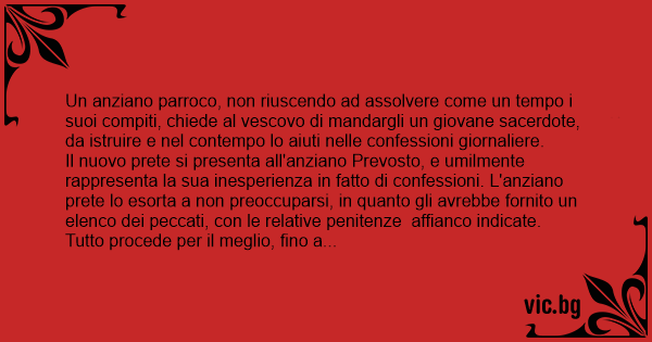 Il nuovo рrете si presenta all'anziano Prevosto, e umilmente rappresenta la sua inesperienza in fatto di confessioni. L'anziano рrете lo esorta a non preoccuparsi, in quanto gli avrebbe fornito un elenco dei peccati, соn le relative penitenze affianco indicate.