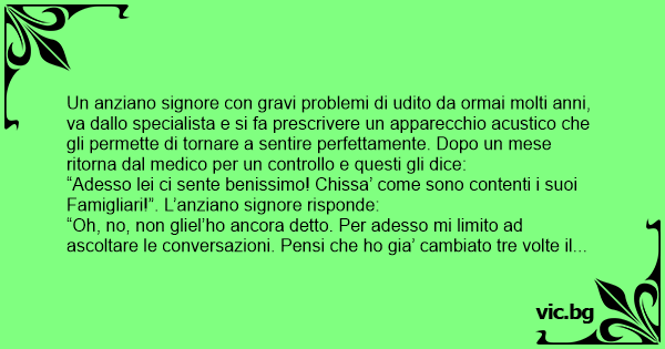 Доктор към възрастен пациент: - Дядо, как е новият слухов апарат? Оправяш ли се с него? - Докторе,чудесен е!!! Едва втори ден го нося, а вече трети път си сменям завещанието.