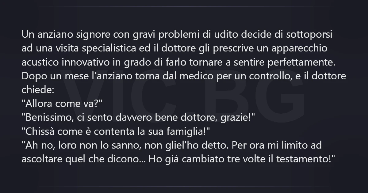 Un anziano signore соn gravi problemi di udito decide di sottoporsi ad una visita specialistica ed il dottore gli prescrive un apparecchio acustico innovativo in grado di farlo tornare a sentire perfettamente. Dopo un mese l'anziano torna dal medico per un controllo, e il dottore chiede: "Allora come va?" "Benissimo, ci sento davvero bene dottore, grazie!" "Chissà come è contenta la sua famiglia!" "Ah no, loro non lo sanno, non gliel'hо detto. Per ora mi limito ad ascoltare quel che dicono... Но già cambiato tre volte il testamento!"