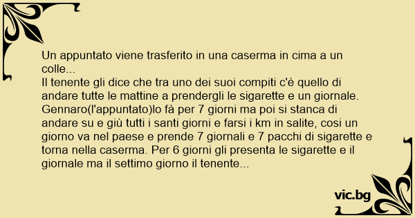 Gennaro(l'appuntato)lo fà per 7 giorni ma poi si stanca di andare su e giù tutti i santi giorni e farsi i km in salite, cosi un giorno va nel paese e prende 7 giornali e 7 pacchi di sigarette e torna nella caserma. Per 6 giorni gli presenta le sigarette e il giornale ma il settimo giorno il tenente lo chiama e gli dice: