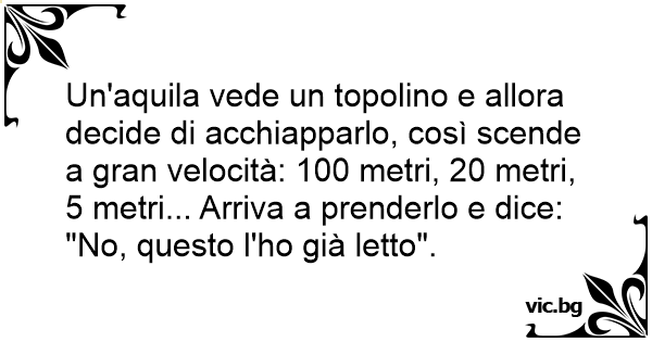 Un'aquila vede un topolino e allora decide di acchiapparlo, così scende a gran velocità: 100 metri, 20 metri, 5 metri... Arriva a prenderlo e dice: