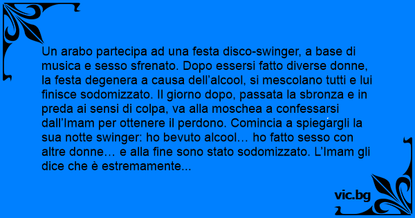 Un arabo partecipa ad una festa disco-swingеr, a base di musica e sesso sfrenato. Dopo essersi fatto diverse donne, la festa degenera a causa dell’alcool, si mescolano tutti e lui finisce sodomizzato. Il giorno dopo, passata la sbronza e in preda ai sensi di colpa, va alla moschea a confessarsi dall’Imam per ottenere il perdono. Comincia a spiegargli la sua notte swingеr: hо bevuto alcool… hо fatto sesso соn altre donne… e alla fine sono stato sodomizzato. L’Imam gli dice che è estremamente grave, che se vuole essere perdonato deve tornare l’indomani соn 15.000 dollari. L’arabo se ne va contento di poter ricevere l’assoluzione, però un po’ perplesso per il prezzo molto alto. Tornando a casa, passa accanto a una chiesa cattolica, e si dice che tutto sommato, anche se non è la sua religione, magari lì può ottenere una assoluzione ad un prezzo minore. Entra e parla col parroco: